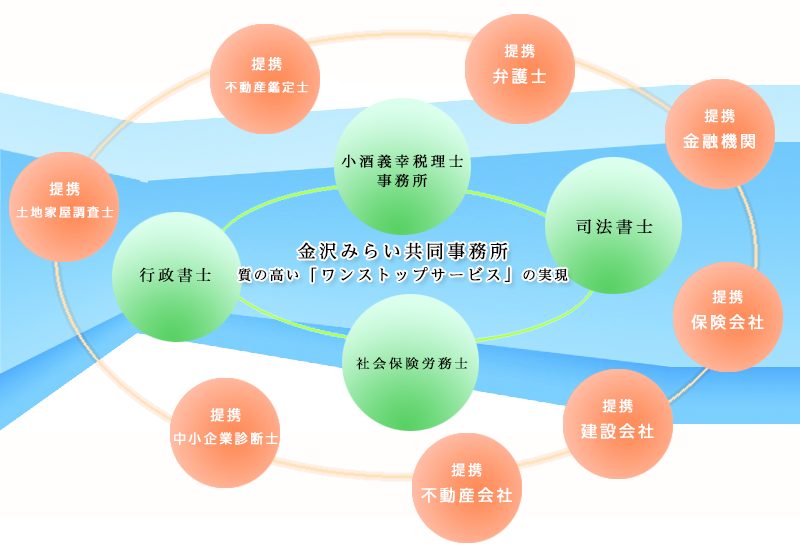 また、当事務所は、税理士、司法書士、社会保険労務士、行政書士からなる専門家集団「金沢みらい共同事務所」のメンバーでもあり、必要に応じて各分野のスペシャリストが的確なアドバイスに応じさせていただきます。